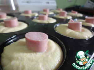 Кладем в каждую формочку по кусочку сосиски, немного утопив ее в тесте.