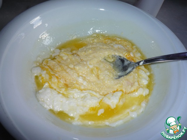 Смешать растопленное сливочное масло, сметану, 1 яйцо, 0,5 ч. л. соли и разрыхлитель.