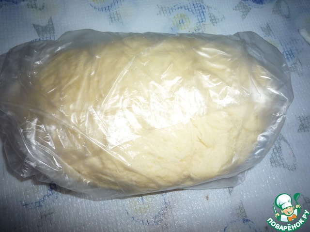 Всыпать муку (2-2,5 стакана, сколько потребует тесто). Замесить мягкое, эластичное тесто. Завернуть тесто в пленку.