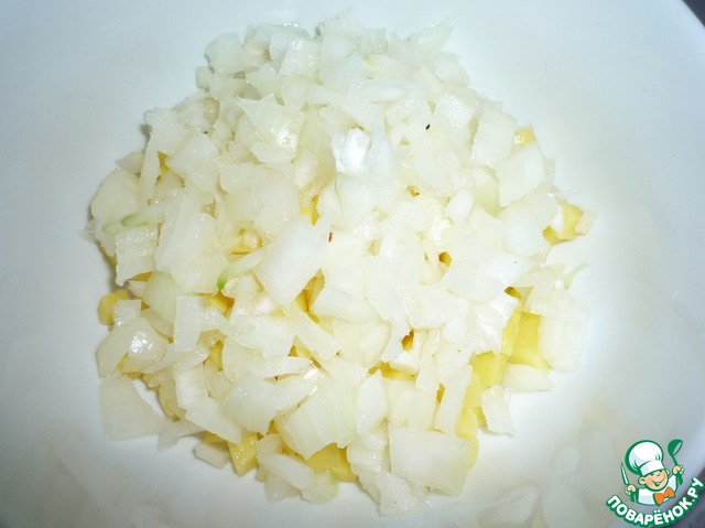 Готовим начинку. Картофель нарезать мелкими кубиками. Мелко нарезать лук.