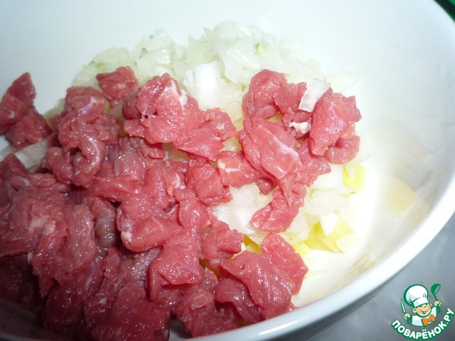 Мясо нарезаем маленькими кусочками. Добавляем к картофелю и луку.