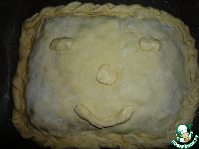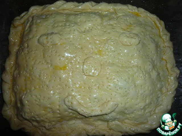 Поверхность смазать яйцом, смешанным с пару ложками воды. Пирог часто наколоть вилкой.