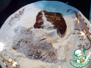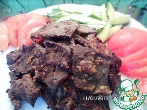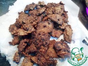 Печень помыть снять плёнку обязательно. Слегка подморозить и порезать на широкие, но тоненькие кусочки.