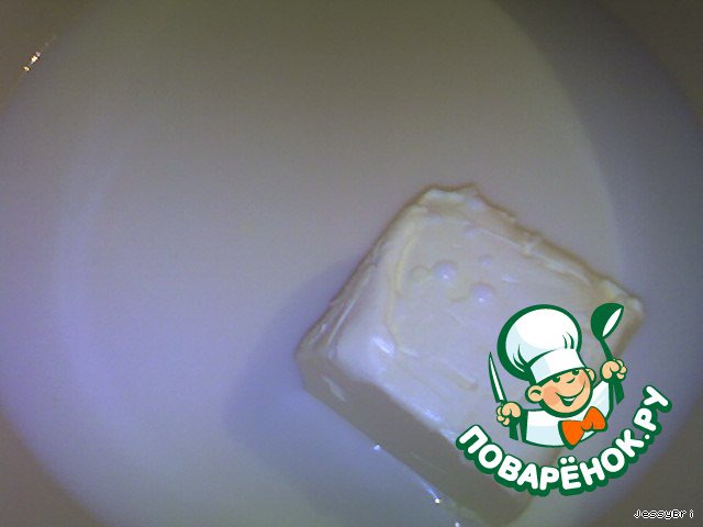 Маргарин кладем в молоко и ставим на водяную баню или на маленький огонь. -