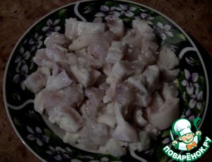Рыбное филе (у меня пангасиус) порезать кубиками. Хорошо смазать солью и сбрызнуть лимонным соком 3-4 ст. л. и оставляем минут на 15-20. Затем сок слить.