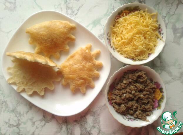 Приготовить начинку: обжарить лук на масле, добавить фарш и слегка обжарить, сыр натереть на тёрке. -