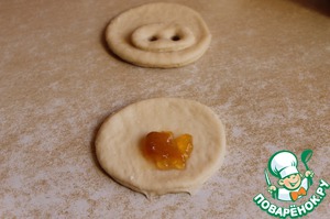 На один кружок кладем ложку начинки, прикладываем другим, с пятаком, придавливаем, защипываем.