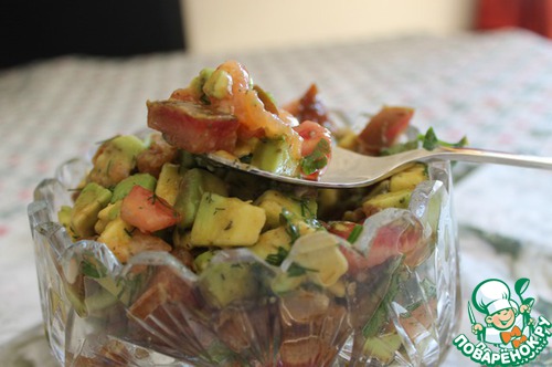 Для праздника можно сделать порционную сервировку в половинках шкурки авокадо (подсмотрела в каком-то ресторане), в этом случае авокадо надо разрезать пополам и мякоть вынуть осторожно ложкой, если он спелый - это легко. Жалко не могу пока фотографию повесить
