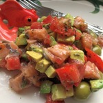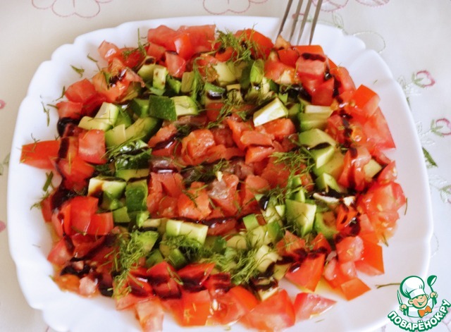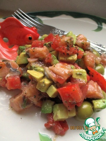 2 помидора средних размеров режем тоже на кубики, можно удалить сердцевину. Красную рыбу режем или рвем на кусочки. Добавляем зелень, можно сбрызнуть лимоном. Поливаем все оливковым маслом, солить не обязательно, на любителя.