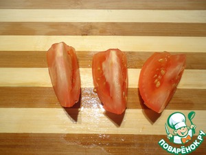 Разрезаем помидор на дольки.