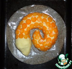 Морковь нарезать тонкими кружочками, украсить пирог и смазать растительным или оливковым маслом.