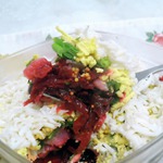 Далее мелко порезанная сельдь, на нее зелень и лук, мелко порезанный, щепотку цедры. Слегка полить соусом (без фанатизма, иначе салат потечет!)