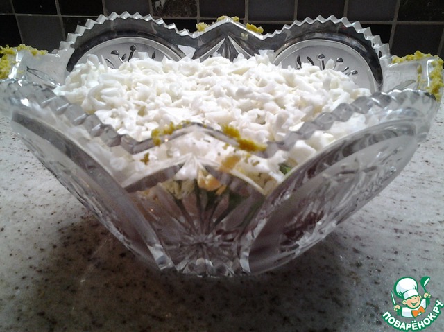 Присыпать белками, тертыми на мелкой терке. Этот слой не поливать.