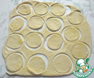 Тесто раскатать в тонкий пласт, смазать сливочным маслом, посыпать сахаром, с помощью формы выдавить круги