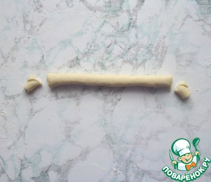 Тесто раскатать в тонкий пласт, диаметром 15 см, смазать сливочным маслом, посыпать сахаром, свернуть в рулет, обрезать неровные концы.
