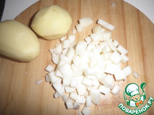 4. Пока супчик варится, нарезаем мелкими кубиками картофель и свинину. Добавляем их в суп. (Если Вы готовите зеленую чечевицу, то ее нужно класть в суп вместе с картофелем)