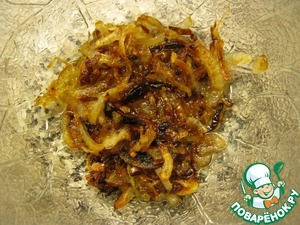 Режем лук тонкими полукольцами и обжариваем на масле до золотисто-коричневого цвета. Лук должен стать мягким, чтобы ни в коем случае не хрустеть на зубах.