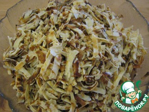 Режем омлеты полосками, соответственно предыдущим ингредиентам. Перемешиваем. Перед подачей заправляем майонезом. Приятного аппетита!
