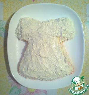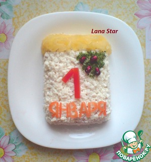 Верх украсить измельченными консервированными ананасами, из помидора вложить "1", из моркови выложить "января".