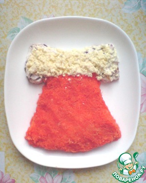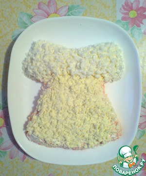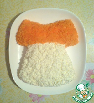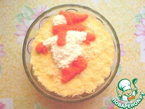 На морковь выложить слой яичных желтков, на желтки выложить слой яичных белков.