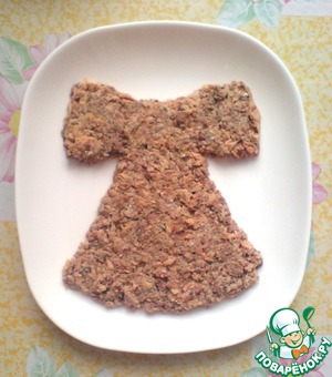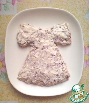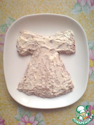 С сайры слить сок, измельчить и выложить на блюдо в виде силуэта колокольчика с бантиком.