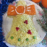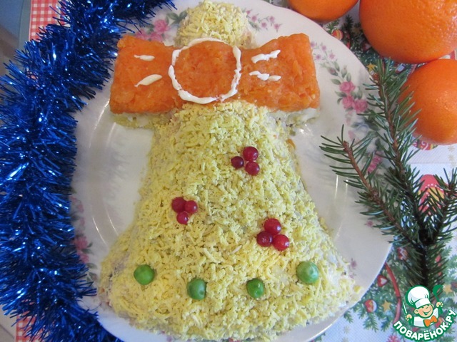 Измельчить яйцо, смешать с майонезом и выложить ручку колокольчика. Салат в виде колокольчика украсить консервированным горошком и ягодами. Готово!