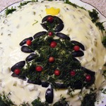Салат "Новогодняя ёлочка". Выложить слоями: сайра+майонез, мелко нарезанный лук+майонез, тертая морковь+майонез, измельченные яичные желтки+майонез, измельченные яичные белки, украсить зеленью, маслинами, морковью, ягодами или зернами граната.