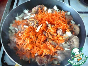Режем чеснок и лук, трем морковь. Добавляем к печени и обжариваем 5-7 минут. Солим, перчим по вкусу.