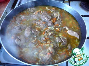 Следующий шаг - тушение. Вливаем в печень стакан воды, ждем пока закипит, и продолжаем тушить на медленном огне.