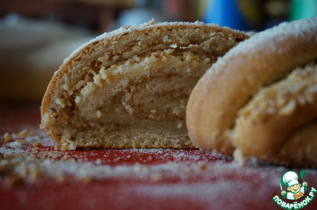 Скатываем не очень плотный рулет, подгибаем края и переносим его на противень. Поскольку рулет такой длины ни на какой противень в прямом виде не помещается, сгибаем его в виде полумесяца (или что-то вроде того) и накалываем по всей длине деревянной шпажкой или зубочисткой, прокалывая почти насквозь. Это нужно для того, чтобы в процессе выпекания и увеличения теста в объеме рулет не лопнул. Но даже если он где-нибудь и лопнет, не переживайте, это, в некоторм роде, классика жанра. Ставим в духовку. Точно такие же манипуляции проводим со второй частью теста, чтобы к моменту испечения первого рулета второй уже был готов.