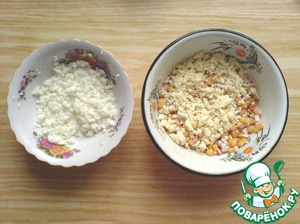 Яйца очистить, отделить белки от желтков и измельчить. Крабовые палочки (мелко нарезать), кукурузу (слить сок), лук (мелко нарезать), яичные желтки, перемешать.