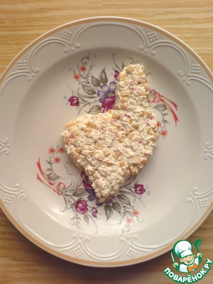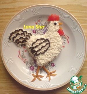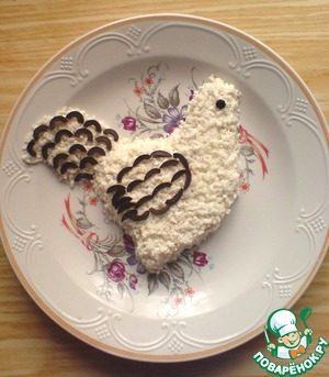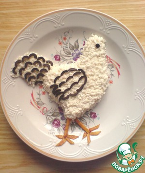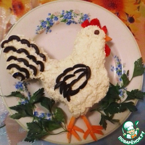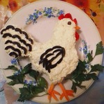 Когда я приготовила салат "Курочка-наседка", мне сразу же пришла идея приготовить салат "Поющий петушок", как же курочка без петушка!:). Так можно оформить любой салат, в составе которого будут присутствовать яйца.