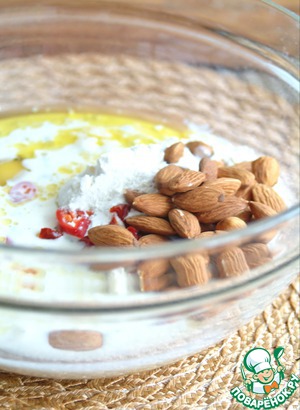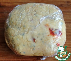 В большой миске смешать просеянную муку с разрыхлителем, добавить яйцо, миндаль, оливковое масло, вяленые томаты, молочно-сырную смесь, перец чёрный и чили по вкусу, если необходимо, посолить, замесить эластичное тесто.