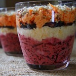 Но лучше бы их в 2 разных рецепта. А то очень пёстро, 2 салата, 4 разных оформления...