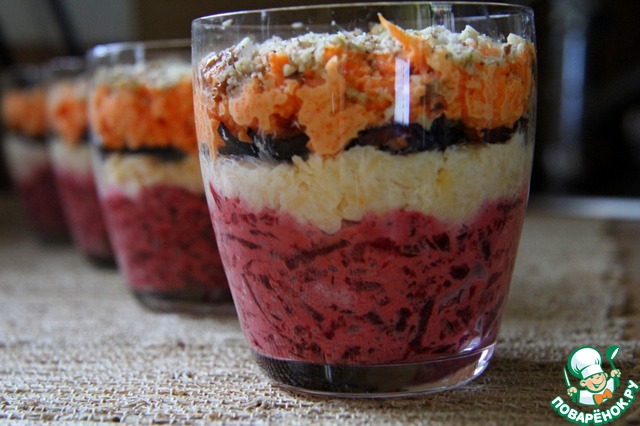 Рецепт приготовления: Морковь (свежую), свеклу (вареную), сырок натереть на терке, изюм размочить в горячей воде, грецкие орехи измельчить, чеснок пропустить через пресс, добавить в майонез и перемешать. Салатик выкладывается слоями и каждый слой нужно смазать чесночным майонезом, но я готовлю немного по-другому: в морковь добавляю изюм, перемешиваю и заправляю чесночным майонезом, выкладываю в креманку (конечно же, можно этот салатик приготовить и в обычной салатнице) - это первый слой. В сыр добавляю майонез с чесноком, перемешиваю - это второй слой. В свеклу добавляю орехи, перемешиваю, заправляю чесночным майонезом - это третий слой. Салатик готов. Украсить можно по желанию. Я предлагаю несколько вариантов простеньких украшений данного салатика. Твердый сыр потереть на самой мелкой тёрке, посыпать сверху салатика, из варёной свеклы с помощью формы выдавить сердечки и выложить на салат. -