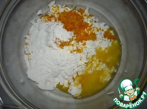 Протертый творог, цедру апельсина, муку, яйцо (яйцо предварительно растереть с сахаром) и 3-4 ст. л. апельсинового сока хорошо перемешать.