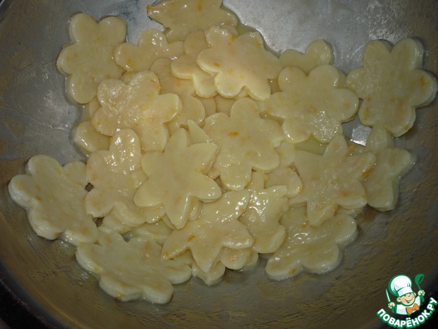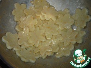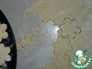 Стол посыпать обильно мукой и раскатать лепешку толщиной 0,5 см. С помощью фигурок для печенья нарезать "цветы".