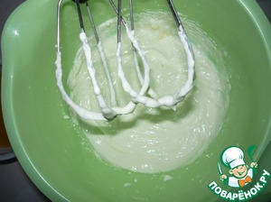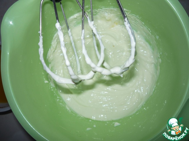 Приготовить соус: охлажденную сметану (я ее предварительно отцедила через марлю, хотя она и так была густая) взбить с сахарной пудрой и 2-3 ст. л. апельсинового сока.