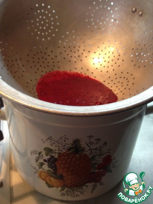 Полученную ягодную массу пропустить через сито. Я еще дополнительно процедила через более мелкое сито, чтобы моей маленькой дочке не попались косточки)
