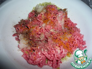 Затем добавить фарш, потертый на терке лук, яйцо, паприку, черный перец и соль.