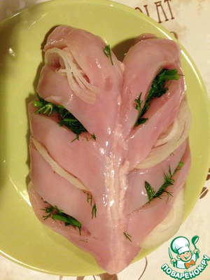 Моем грудку, очищаем от кожи и жира, делаем надрезы и внутрь кладем лук и зелень.