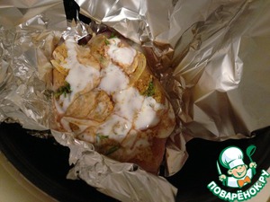 Я оставила в соевом соусе с лучком-чесночком и зеленью помариноваться на час, потом в форму, полила кефиром и в духовку. Фольгу не использовала, и так вкусно).