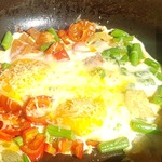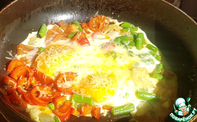Добавить фасоль, все вместе потушить мин. 5. Отдельно в чашке разбить яйца, взбить венчиком, залить в массу, сверху посыпать тертым голланским сыром и поставить в духовку. До расплавления сыра.