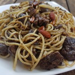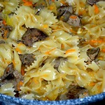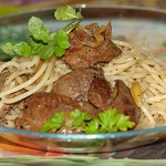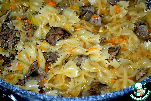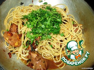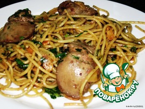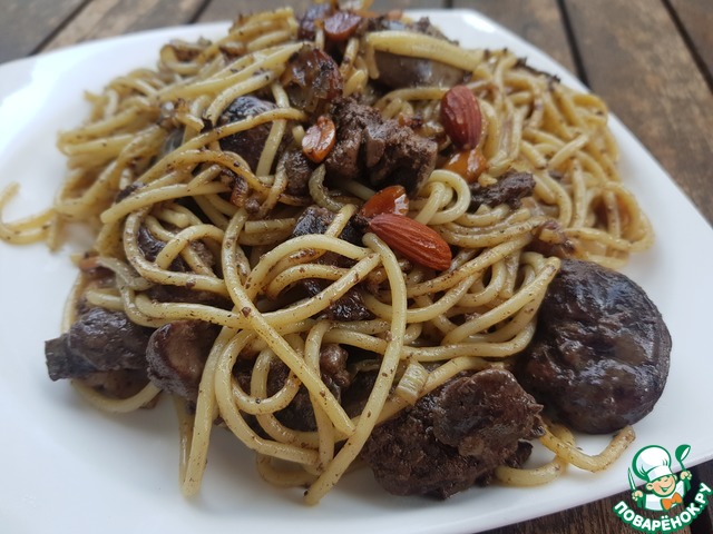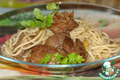 Красиво звучит, а по-нашему очень просто - спагетти с куриной печенкой.