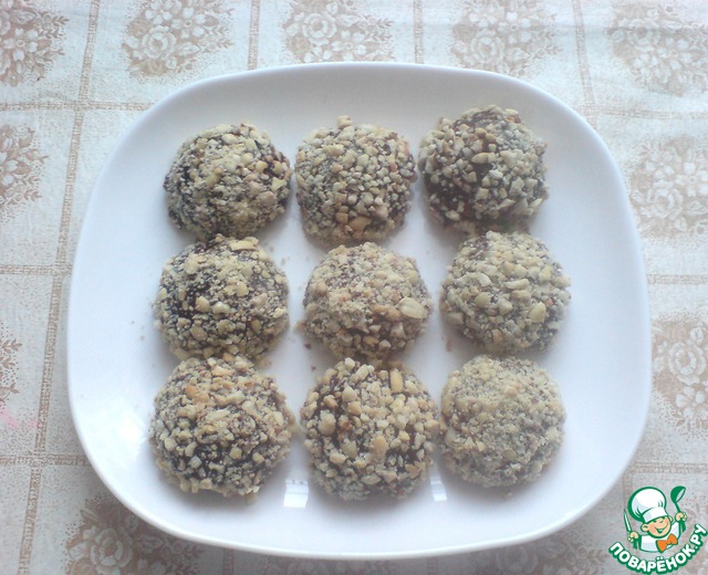 Орехи измельчить. Печенье в виде шариков обмакнуть в шоколадную глазурь, затем обвалять в орехах. Поставить на холод для застывания глазури. Готово!