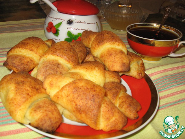 По сути обычные творожные рогалики, только с начинкой. Обычно я в тесто кладу сметану вместо творога. Но сегодня сметаны не было, и я воспользовалась творогом :) Рецепт нравится мне тем, что в тесте совершенно нет ни сахара, ни яиц! Готовится очень быстро, а результат... ПРЕВОСХОДНЫЙ!)