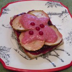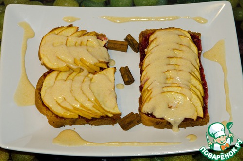 • Обильно смазываем хлеб малиновым вареньем и выкладываем дольки яблок сверху.