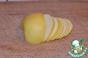 • Яблоко делим напополам и нарезаем тонкими дольками. Можно оставить кожуру, а можно предварительно очистить яблоко - по вашему предпочтению.