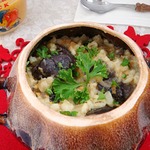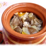 На дно горшочка (у меня горшочек 800 мл) кладем наши грибы, сверху перловку, залить 100 г кипятка. И в духовку на 180* на 30 мин.