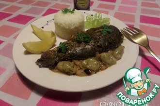 Сделала небольшие отступления: в конце обжаривания лука сверху выложила рыбу (сырую, не стала ее предварительно варить) и вылила в сковородку маринад, подержала рыбу на луке пару минут под закрытой крышкой. Тем временем сметану разбавила водой и добавила муки, что бы соус был погуще. Подавала с рисом, сверху рис полила подливой.